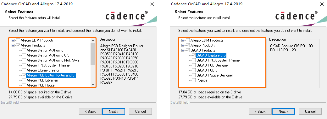 在接下来的安装特性选择对话框当中,只需要选择【OrCAD Products】下面的 OrCAD Capture CIS 和【Allegro Products】下面的 Allegro PCB Editor Router and SI 两款工具即可: