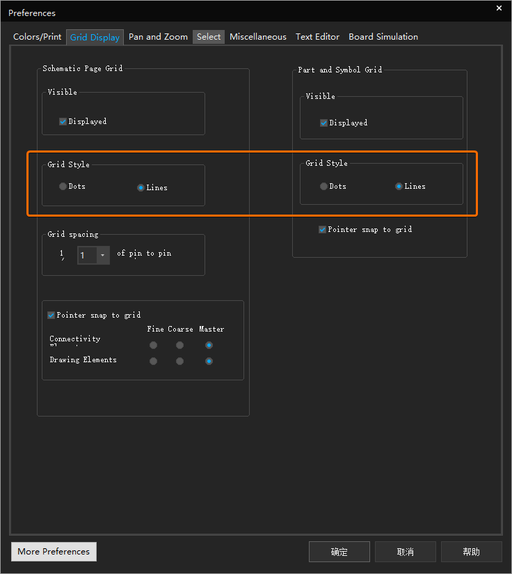 然后,切换至【Grid Display】选项卡,修改工作区的网格风格为线条