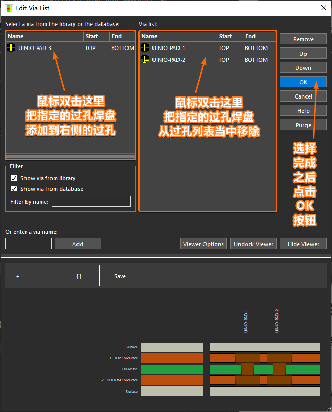 在弹出的 Edit Via List 对话框当中,使用鼠标双击左侧待选的过孔,就可以将其添加至右侧的 PCB 过孔列表当中,操作完成之后点击【OK】按钮。接下来就可以在 PCB 布线过程当中,双击鼠标左键实现打孔换层的操作: