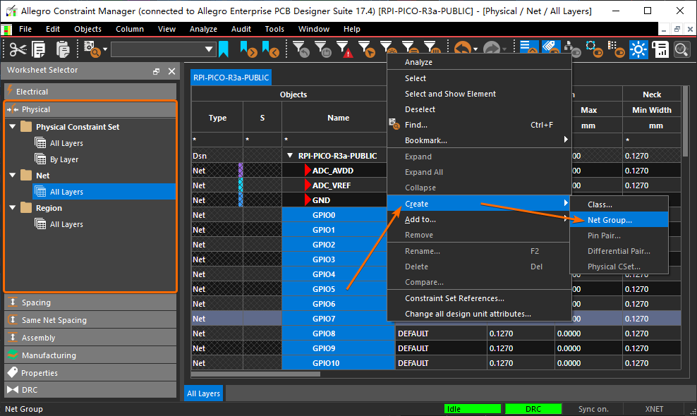 网络类 Class 通常用于依照功能模块对电路网络进行分类,鼠标依次选择 约束管理器窗口 左侧的【Physical -> Net】菜单项,然后使用【Ctrl/Shift + 鼠标左键】选中多个网络,再点击鼠标右键菜单中的【Create -> Class...】创建 Class 网络类: