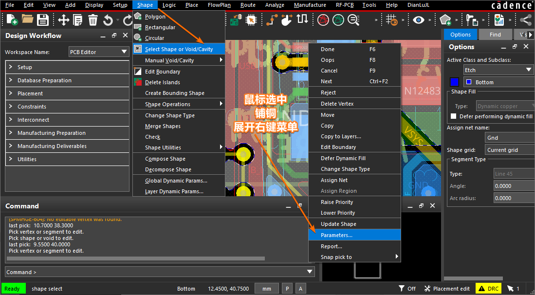 首先点击 Allegro PCB Editor 菜单栏上的 【Shape -> Select Shape or Void/Cavity】选中 PCB 上已经铺铜的区域,然后选中鼠标右键菜单上的【Parameters】选项,在打开的对话框里就可以调整该铺铜区域的各项属性: