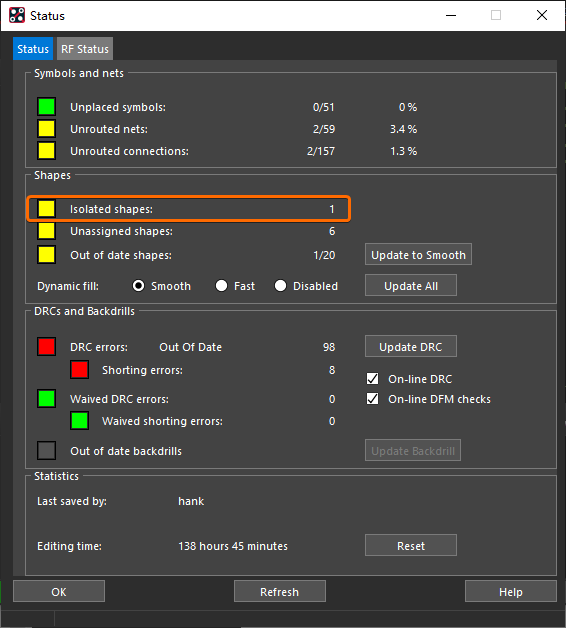 孤铜是指在 PCB 中孤立无连接的覆铜区域,通常需要对其进行删除处理。首先执行 Allegro PCB Editor 菜单栏上的【Display -> Status】命令,查看当前 PCB 版图当中是否存在有孤铜区域: