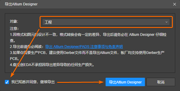 .eprj2),然后在其原理图编辑器当中放置元件,并且鼠标点击工具栏上的设计 -> 更新/转换原理图到 PCB,将元件的原理图符号映射同一工程下面的 PCB 版图,最后再选择工具栏上的文件-> 导出 -> Altium Designer...将整个工程导出为 Altium Designer 格式保存在本地并且解压.zip文件: