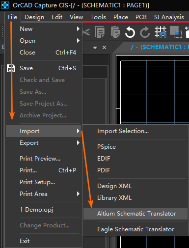 File -> Import -> Altium Schematic Translators,导入刚才新建的后缀名为.PrjPcb的 ASCII 格式 Altium Designer 工程文件: