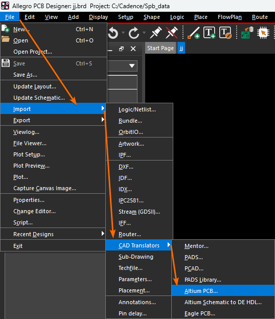 .brd版图文件,然后依次选择工具栏上的File -> Import -> CAD Translators -> Altium PCB...,将刚才新建的后缀名为.pcbdoc的 ASCII 格式 Altium Designer 工程文件导入: