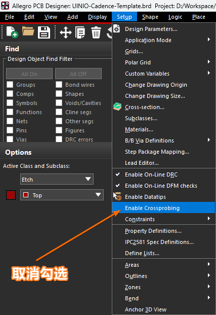 顶部菜单栏上的 Setup,取消 Enable Crossprobing