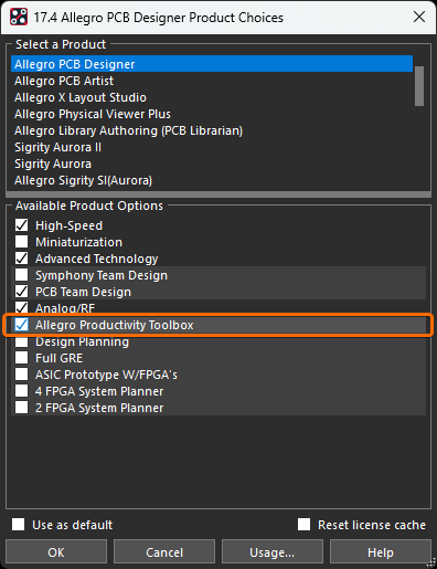 File -> Change Editor...,然后选择【Allegro PCB Designer】,并且勾选所需的功能项,例如High-Speed、PCB Team Design、Analog/RF、Allegro Productivity Toolbox;