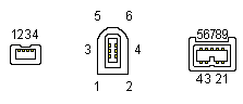 下图从左至右分别展示了简化掉电源引脚的 4 Pin 引脚的 Mini IEEE1394a 连接器、6 Pin 引脚的标准 IEEE1394a 连接器,以及 9 Pin 引脚的 IEEE1394b 标准连接器。