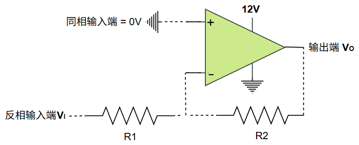 -,输出信号与输入信号反相(存在180°相位差),其输入信号和反馈网络都连接到运算放大器的反相输入端,而同相输入端直接连接到地。