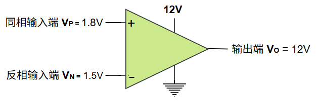 例如,当 同相输入端 \(V_P = 1.8V\),反相输入端 \(V_N = 1.5V\),则运放的输出端 \(V_O = 12V\):