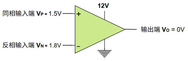 反之,如果 同相输入端 \(V_P = 1.5V\),反相输入端 \(V_N = 1.8V\) 的时候,那么运算放大器的输出端电压 \(V_O = 0V\):