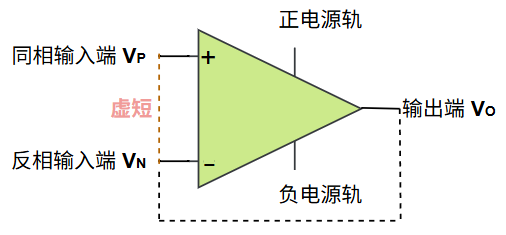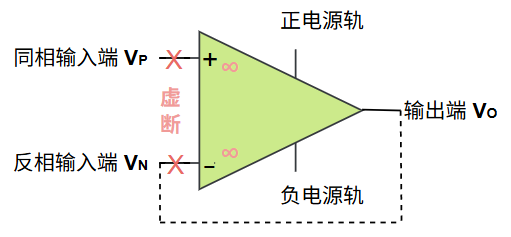 - 虚短:在形成深度负反馈之后,同相输入端 \(V_P\) 与反相输入端 \(V_N\) 两端的电压相等,类似于两端电压是被短路在一起的。