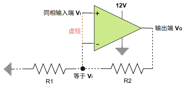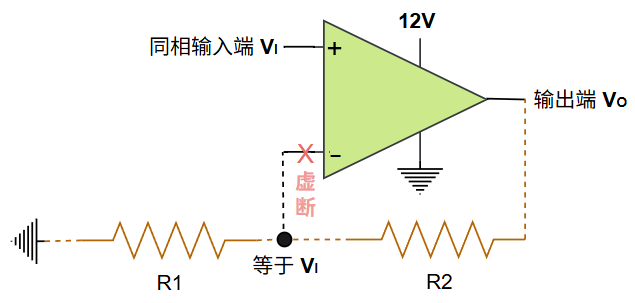 由于运算放大器虚短的存在,其同相输入端 \(V_P\) 与反相输入端 \(V_N\) 两端的电压相等,作用效果类似于这两端直接被连接在一起: