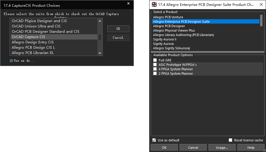 安装完成之后,分别在开始菜单栏输入 Capture CIS 17.4PCB Editor 17.4 就可以打开相应的原理图与 PCB 设计工具。在接下来弹出的产品选择对话框当中,通常会分别选择 OrCAD Capture CIS 作为原理图编辑工具,而 Allegro Enterprise PCB Designer Suite 作为 PCB 绘制工具: