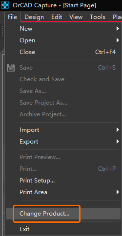 如果需要重新选择原理图编辑器,则可以在没有打开任何原理图工程的情况下,启动 Capture CIS 17.4 之后,鼠标依次选择菜单栏上面的【File -> Change Product...】项:
