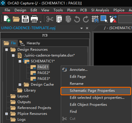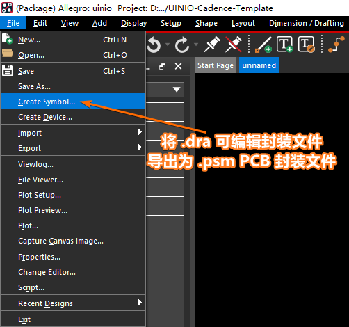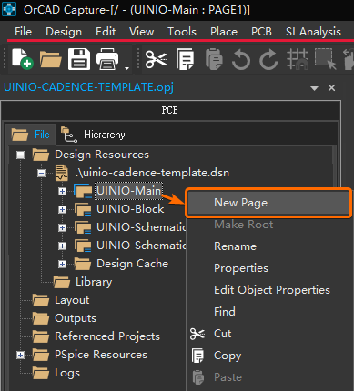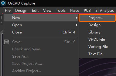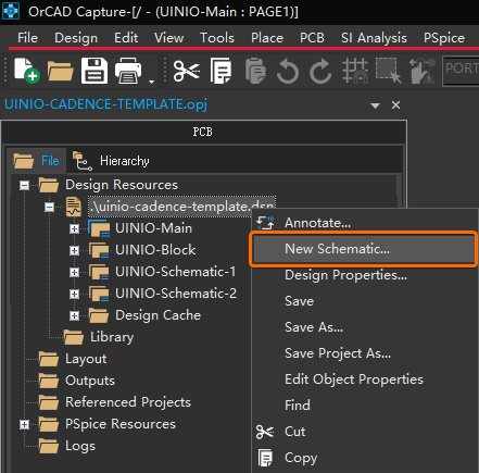 首先,在操作系统的当前工作目录下,手动新建一个 UINIO-Cadence-Template 空文件夹,然后打开 OrCAD Capture CIS 菜单栏的【File -> New -> Project...】新建一个工程