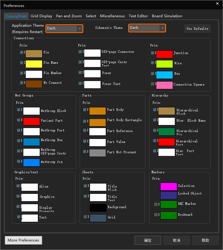 Cadence SPB SPB 17.4 带来的一大变化就是可以支持暗黑界面的显示,鼠标点击 OrCAD Capture CIS 菜单栏上的【Options -> Preferences】,在弹出的 Preferences 对话框里,修改【Colors/Print】选项卡下的 Application Theme 项为 Dark
