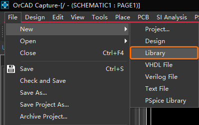 接下来,在上面新建的 UINIO-Cadence-Template 工程当中,鼠标依次点击 OrCAD Capture CIS 菜单栏上的【File -> New -> Library...】,新建一个原理图符号库