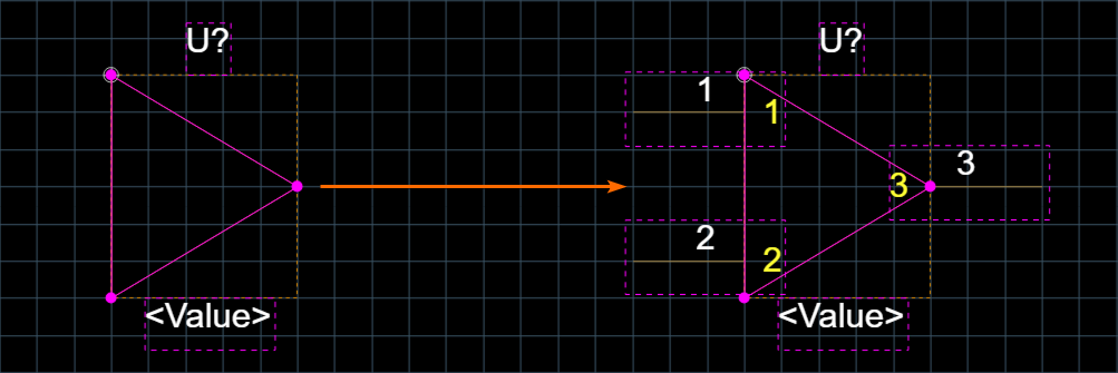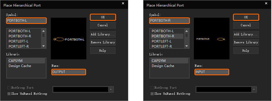 在紫色的虚线图框当中,绘制完原理图符号(下图左),并且完成引脚的放置(下图右)之后,所得到的效果如下面所示: