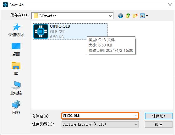 此时会弹出下面的对话框提示你选择一个保存位置,在这里我们将上面默认的原理符号库名称修改为 UINIO.OLB,并将其保存到 UINIO-Cadence-Template 工程的 Libraries 目录下面:
