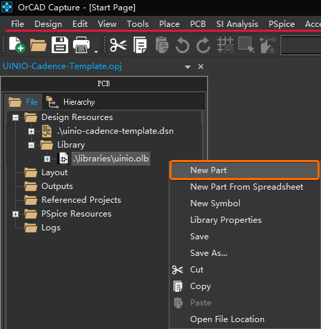 OrCAD Capture CIS 左侧的工程列表当中,再次选中修改名称之后的 UINIO.OLB。按下鼠标右键并点击弹出菜单当中的【New Part】,新建一个原理图符号