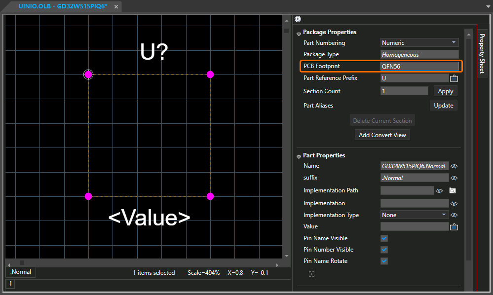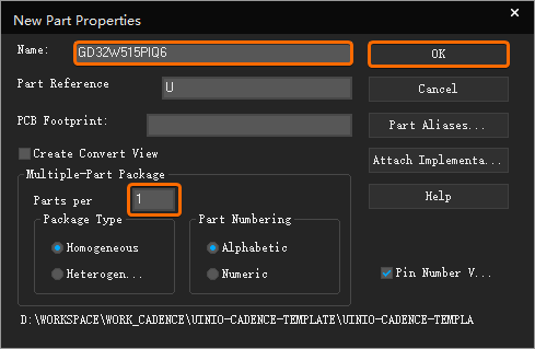 此时会弹出 New Part Properties 对话框,需要再继续填写原理图符号的名称(这里假设为GD32W515PIQ6),然后鼠标点击【OK】按钮: