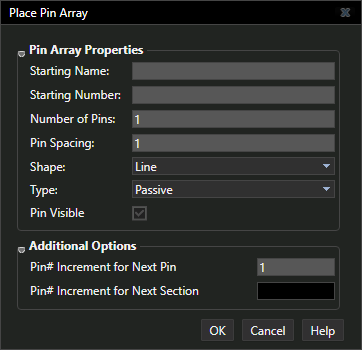 如果需要批量放置多个引脚,则可以鼠标点击菜单栏上的【Place -> Pin Array】或者按下【Shift + J】快捷键,在弹出的 Place Pin Array 对话框进行如下设置: