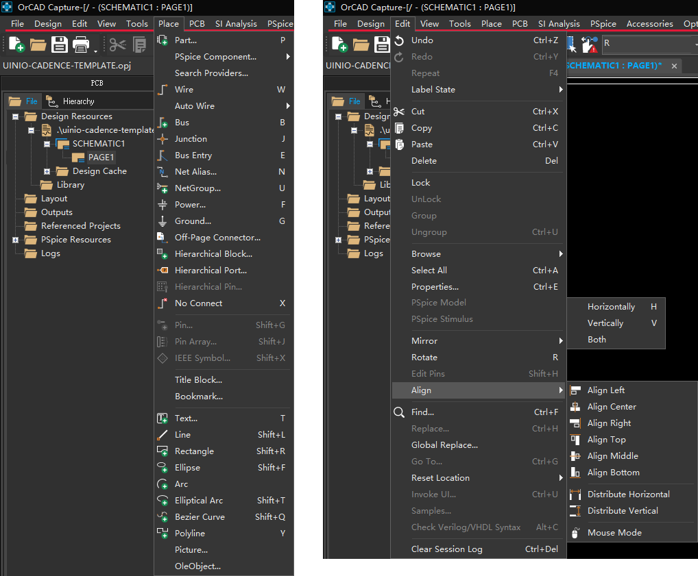 接下来,展开菜单栏上的【Place】选项(如下图所示),或者点击 OrCAD Capture CIS 右侧绘制工具栏上的对应图标,就可以在虚线框里面绘制原理图符号的形状并且放置引脚: