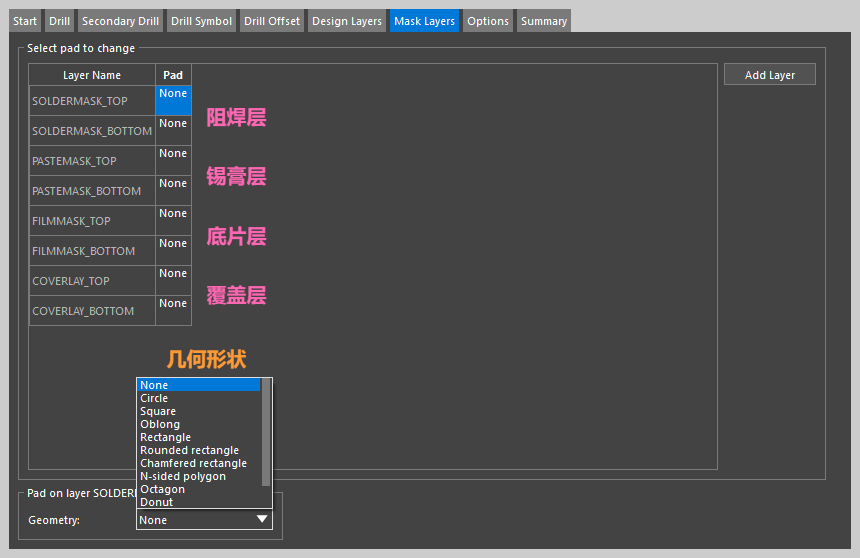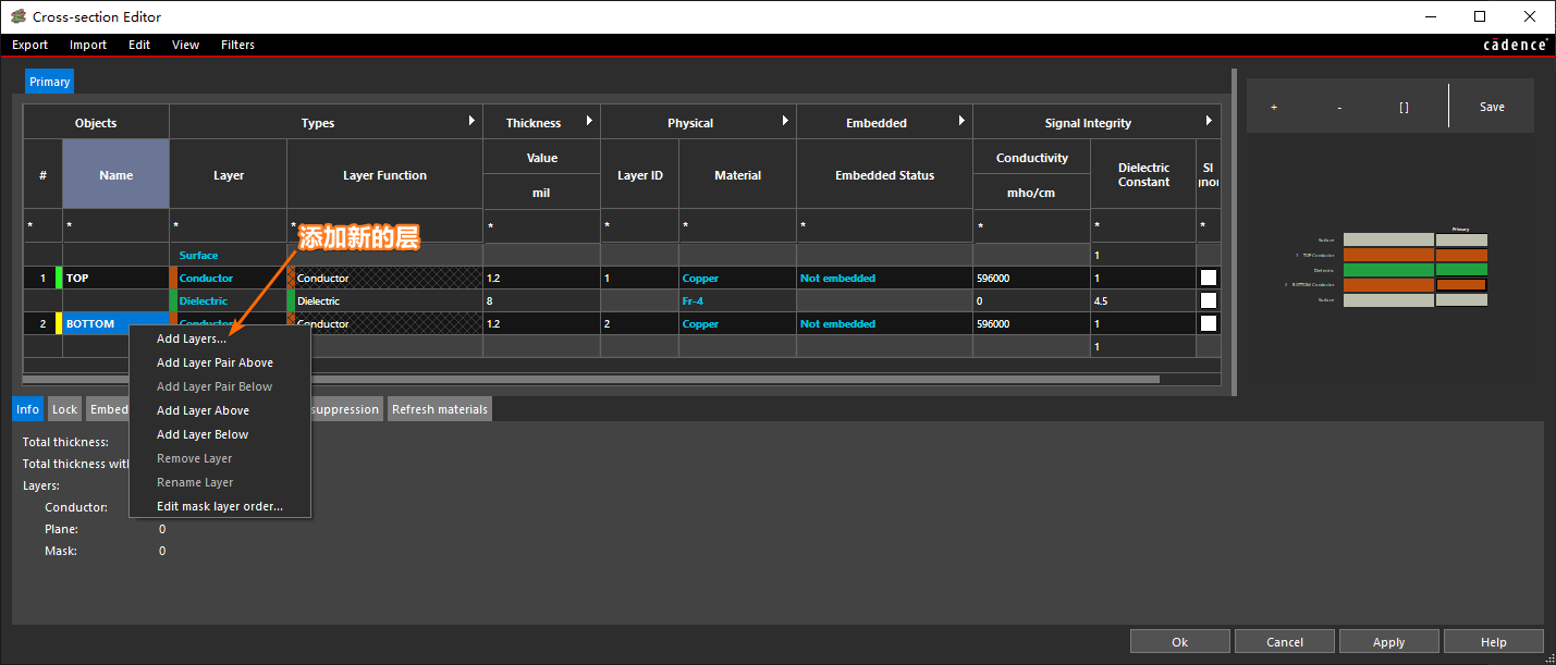 在叠层名称上展开鼠标右键菜单,单击上面的【Add Layer】项,就可以添加新的 PCB 叠层(需要指定叠层的类型功能材料):