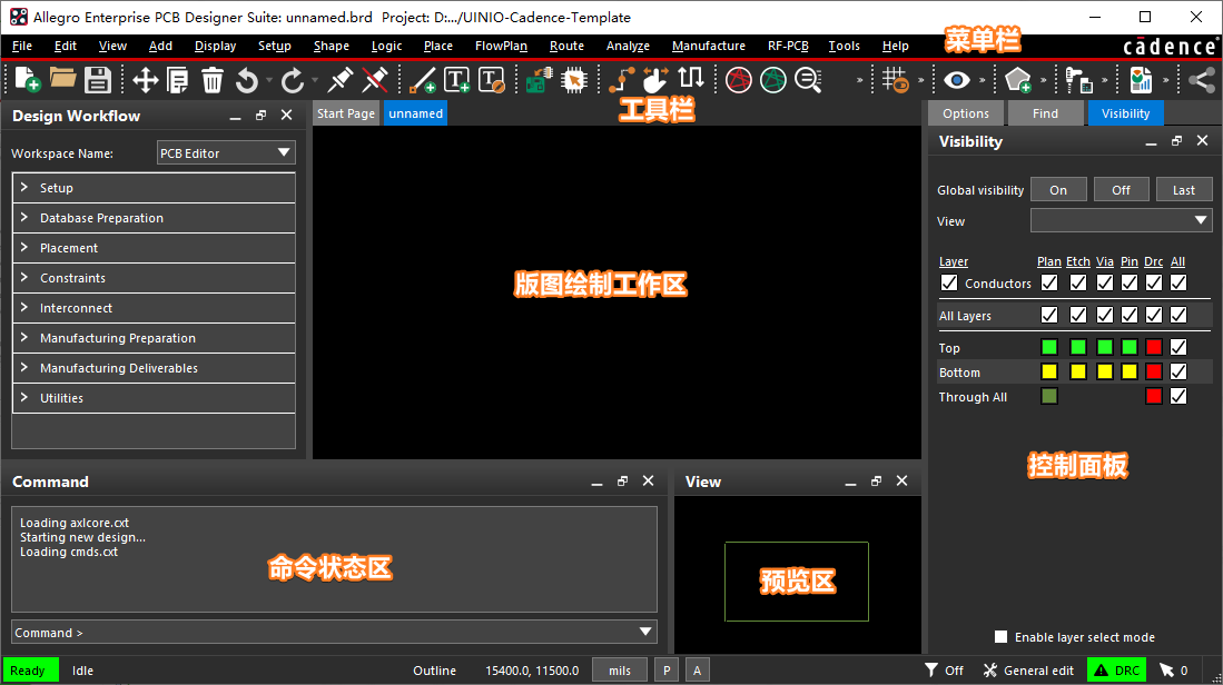 打开 Cadence SPB 套件当中的 OrCAD Capture CIS 之后,呈现出的主界面如下图所示: