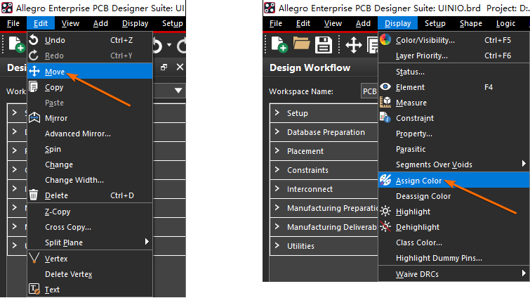 在导入 Cadence SPB 网表之后,首先需要在 Allegro PCB Editor 中执行【Move】命令,选中 PCB 版图上的元件(下图左)。然后选择菜单栏上的【Display -> Assign Color】,高亮 PCB 版图上被选中的元件,此时原理图当中对应的元件就会自动被选中: