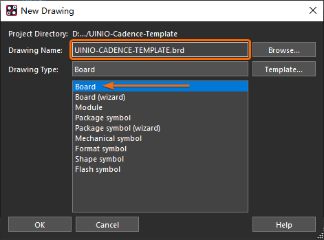 在弹出的对话框当中,分别填写工程的名称,并且指定工程所在的位置,也就是上面新建的 UINIO-Cadence-Template 目录: