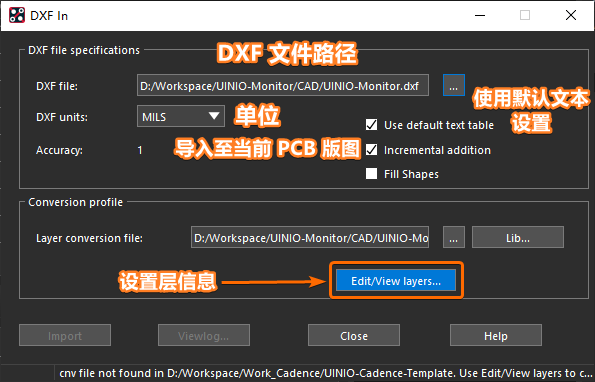 DWG 或者 DXF 格式的板框文件,由结构工程师借助专业的 CAD 工具绘制而成,鼠标依次点击 Allegro PCB Editor 菜单栏上的【File -> Import -> DXF】,在弹出的对话话中进行如下设置:
