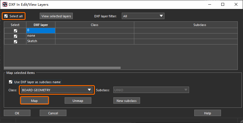 选择 DXF 文件所要导入的图层(通常选择 BOARD GEOMETRY),其它设置项可以参考下图进行修改,最后按下【Map】按钮将这里设置的 ClassSubclass 映射到 DXF 图层: