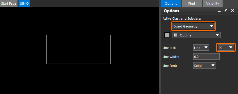 除此之外,Allegro PCB Editor 还支持自定义简单形状的 PCB 板框,鼠标点击菜单栏上的【Add -> Line】命令,就可以在 Board Geomertry 层(在右侧控制面板指定)绘制自定义的 PCB 板框: