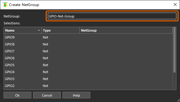 网络分组 Net Group 用于对某一类型的信号进行分组,例如 DDR 颗粒的同一组 D0~D7 数据线就可以创建为一组 Net Group。其创建步骤与网络类 Class 相似,不同之处在于点击的是鼠标右键菜单上的【Create -> Net Group...】项: