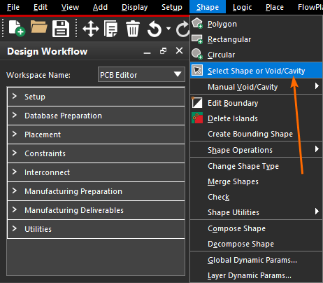 选择铺铜区域 点击菜单栏上的【Shape -> Select Shape or Void/Cavity】选项,然后再在 PCB 版图上执行选择操作。