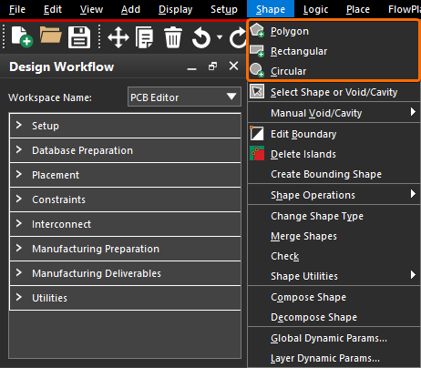 执行 Allegro PCB Editor 菜单栏上的【Shape -> Polygon/Rectangular/Circular】项,就可以手动绘制出多边形矩形圆形的铺铜区域: