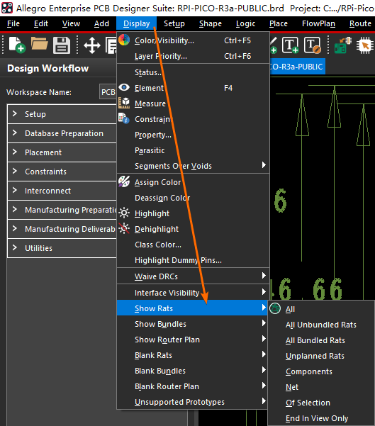 执行 Allegro PCB Editor 菜单栏上的【Display -> Show Rats/Blank Rats】可以显示或者隐藏 PCB 版图上各个元件的原理图飞线连接关系,在弹出的下拉菜单里存在有 All(显示/隐藏所有的飞线)、Net(显示/隐藏指定网络的飞线)、Components(显示/隐藏所选择的元器件的飞线)三个选项: