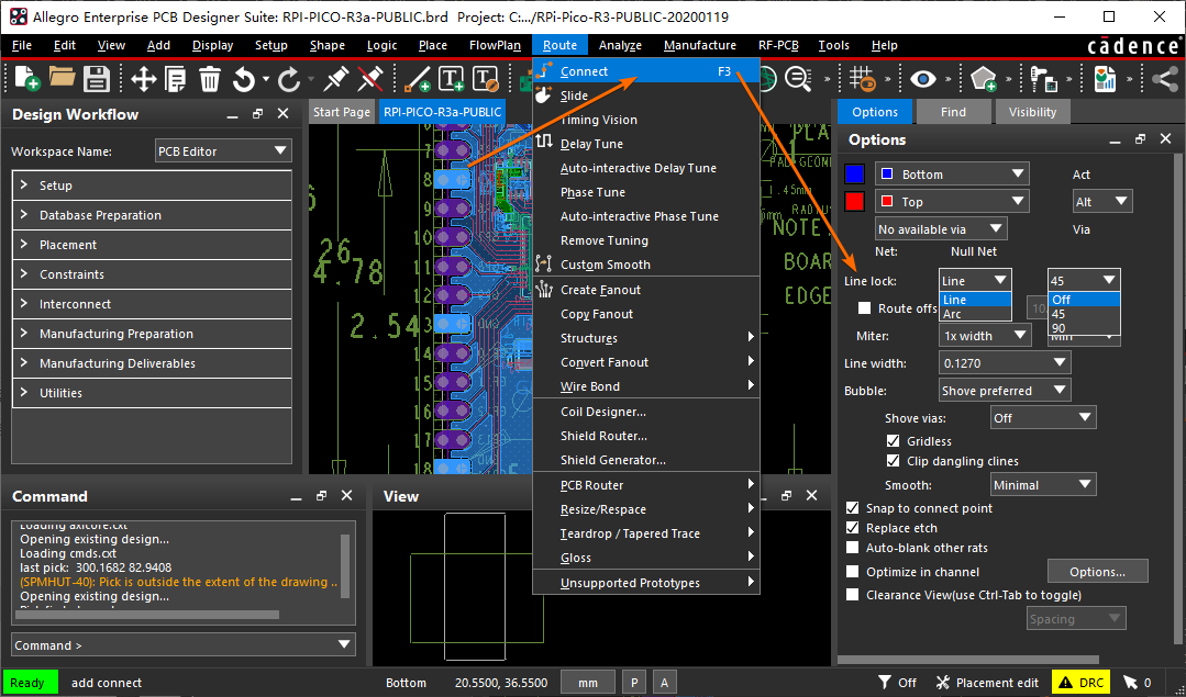 在布线过程当中,经常需要调整走线的形状以及弯折的角度,此时可以执行 Allegro PCB Editor 菜单栏上的【Route -> Connect】命令,将【Options】面板中的 Line Lock 修改为 Line/Arc(走线形状)以及 Off/45/90(走线弯折角度):