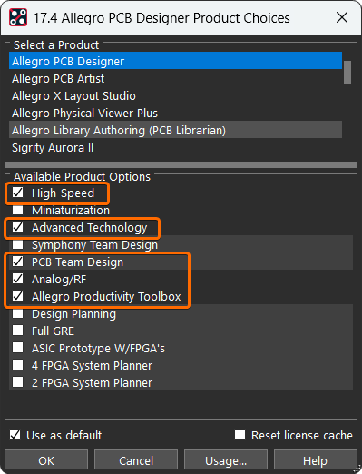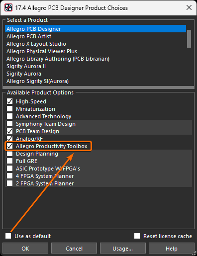 File -> Change Editor...,然后选择【Allegro PCB Designer】,并且勾选所需的功能项,例如High-Speed、PCB Team Design、Analog/RF、Allegro Productivity Toolbox;