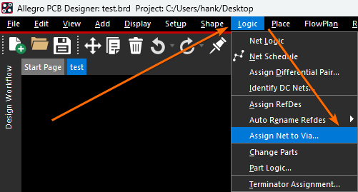 Logic ->Assign Net to Via... 命令,指定当前 PCB
