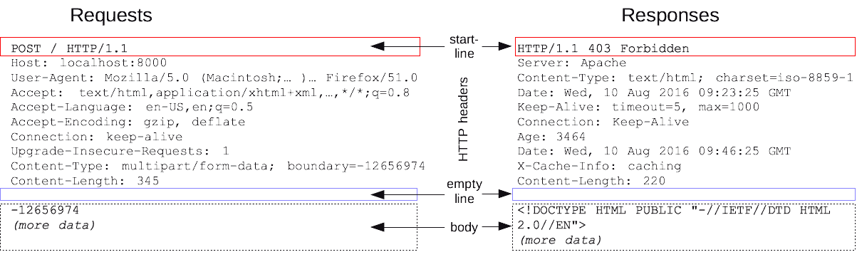 报文是Client和Server之间交换状态与数据的载体,分为由客户端发出的请求request,以及服务器收到请求后的响应response,报文的构建由Client端的浏览器和Server端的